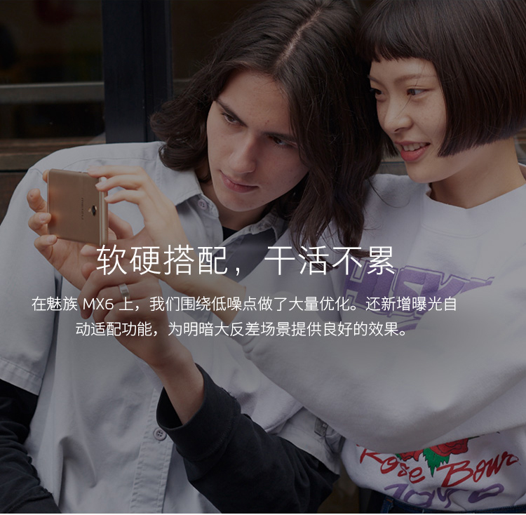 拍照方面,魅族MX6前置500萬像素攝像頭,為OV5695傳感器,光圈f/2.0,支持魅族自家FotoNatino2.0智能美顏和Face AE面部曝光增強;其后置1200萬像素攝像頭,為索尼Exmor RS IMX386傳感器,單個像素為1.25微米,采用藍玻璃濾光片,6片式鏡頭設計,光圈f/2.0,支持高密度相位檢測。